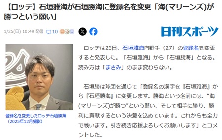 酒田三中の石垣雅海(ロッテ)が登録名を変更したそうです!
