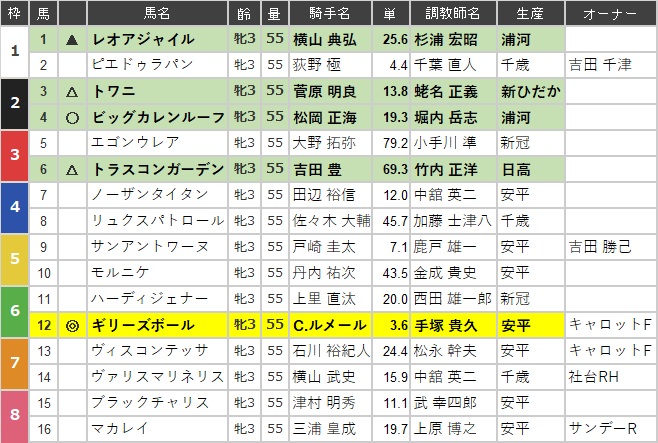 「カネモチの大手馬主」(=社台、キャロット等)の馬は他にも出走しているズラが、