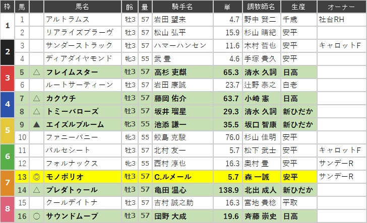 日高の敵であるノーザンファーム(=安平)(もしくは社台ファーム(=千歳))生産、 「カネモチの大手馬主」(=社台、キャロット等)の馬は他にも出走しているズラが(略)